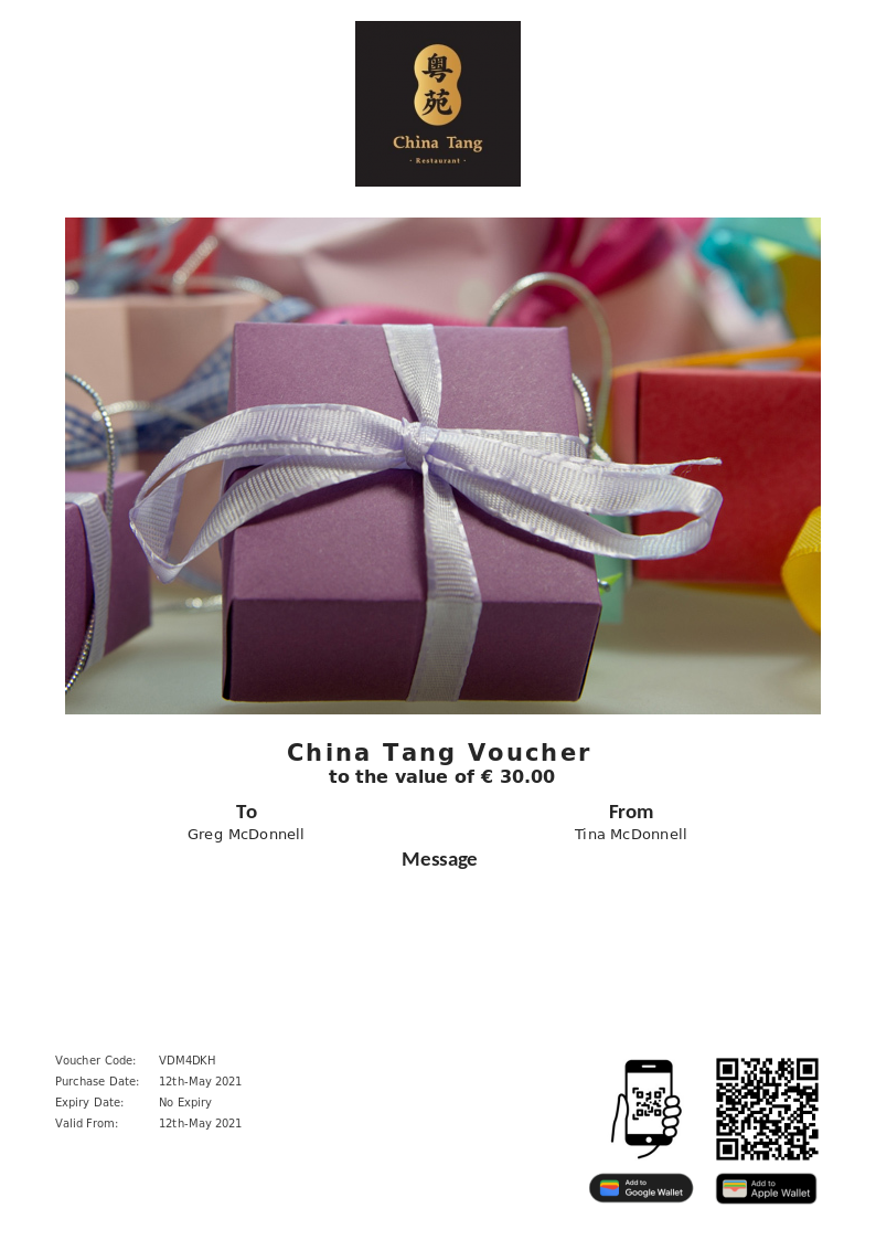 China Tang allows you to purchase instantly printable gift vouchers, special offers and tickets using the Voucher Connect platform.
